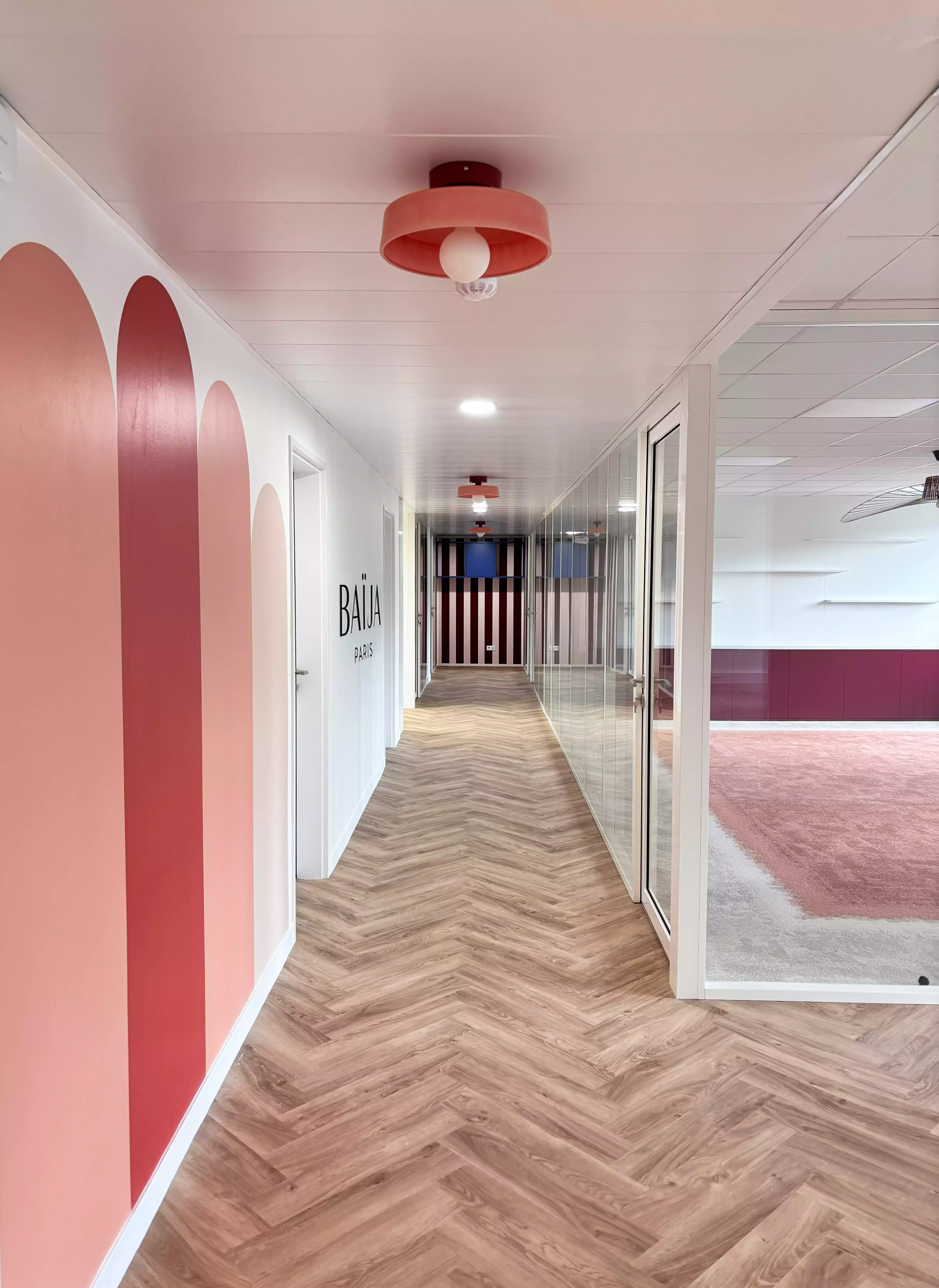 Le papier peint constitue l’élément structurant du projet et donne le ton de chaque espace. Plutôt que des teintes uniformes, chaque zone est habillée d’un revêtement distinct — rayures bordeaux, rose poudré, orange ou motifs graphiques — tout en restant inscrit dans une palette cohérente. Les circulations deviennent ainsi de véritables expériences visuelles, où chaque cloison affirme une identité propre. Le couloir, souvent secondaire, est ici valorisé comme un espace central grâce à une fresque aux arches terracotta et pastel, intégrant subtilement le logotype Baïja Paris et transformant le passage en signature de marque. Cette approche s’appuie sur une palette inspirée de l’univers de Baïja : couleurs saturées, contrastes francs et matières vivantes. L’ensemble — showroom, bureaux, tisanerie — forme un environnement cohérent, chaleureux et stimulant, loin des codes du bureau classique, où l’énergie de la marque se ressent dès l’entrée.